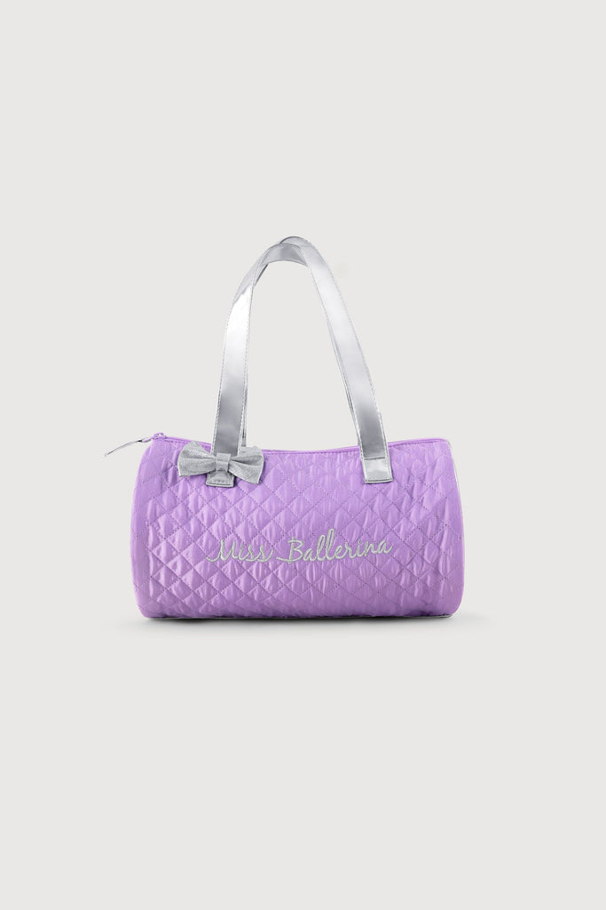 Designed for an aspiring young dancer, the Miss Ballerina bag is lightweight and a perfect introductory bag for a dancer just starting out. A soft, diamond body motif and metallic hand-held straps make for an easy-to-carry bag on the go. With silver piping, glitter bow, and an embroidered 'Miss Ballerina' for an extra