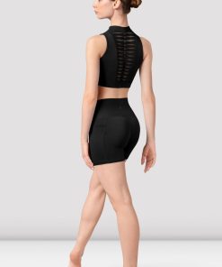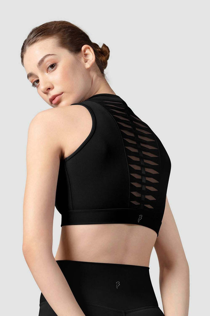 Our Ladies Alix Zip Front Crop Top features a sophisticated high neck with a zip front closure and a soft mesh twist back detail. Pair with our Harrieta V Front Shorts or Beau Full Length Leggings for your perfect dancewear look. Features High neck Zip front closure Mesh laser-cut twist woven back detail Cropped length